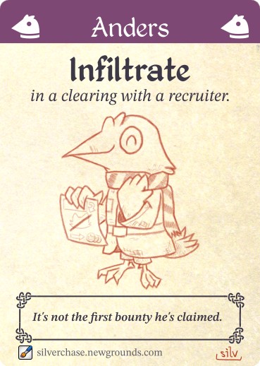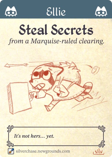 Thwip! An arrow flew towards their backs, coming from the small squad of Marquise soldiers chasing close behind them. The vagabonds had neither the numbers nor the weaponry to defend against the soldiers.
